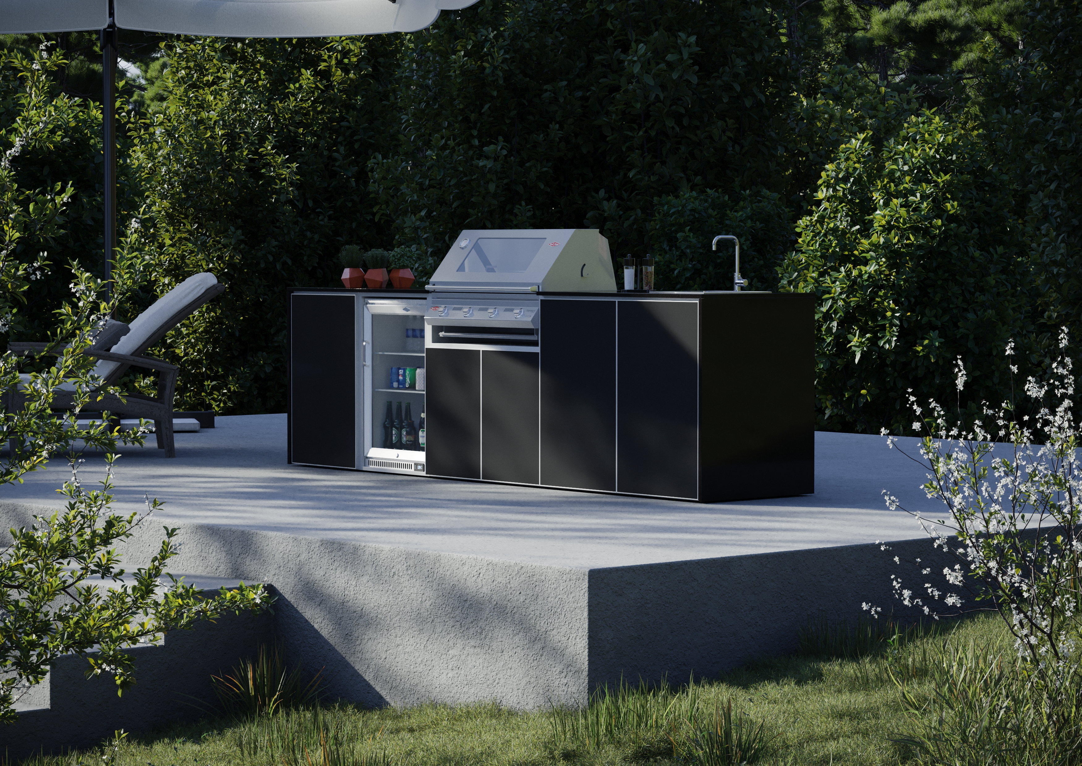 Please see our guide prices on bespoke outdoor kitchens. These prices include a signature Beefeater 4 burner BBQ, fridge and ceramic doors, end panels and worktops. Our standard unit colour will be anthracite grey, but you can pay an additional cost and have your units in any alternate colour.