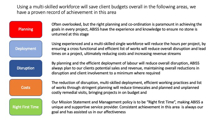 ABISS is a privately owned company with a portfolio of multi-disciplined services and a proven track record of providing combined solutions to projects from audit, project management, shopfitting, installation and joinery in the commercial markets.